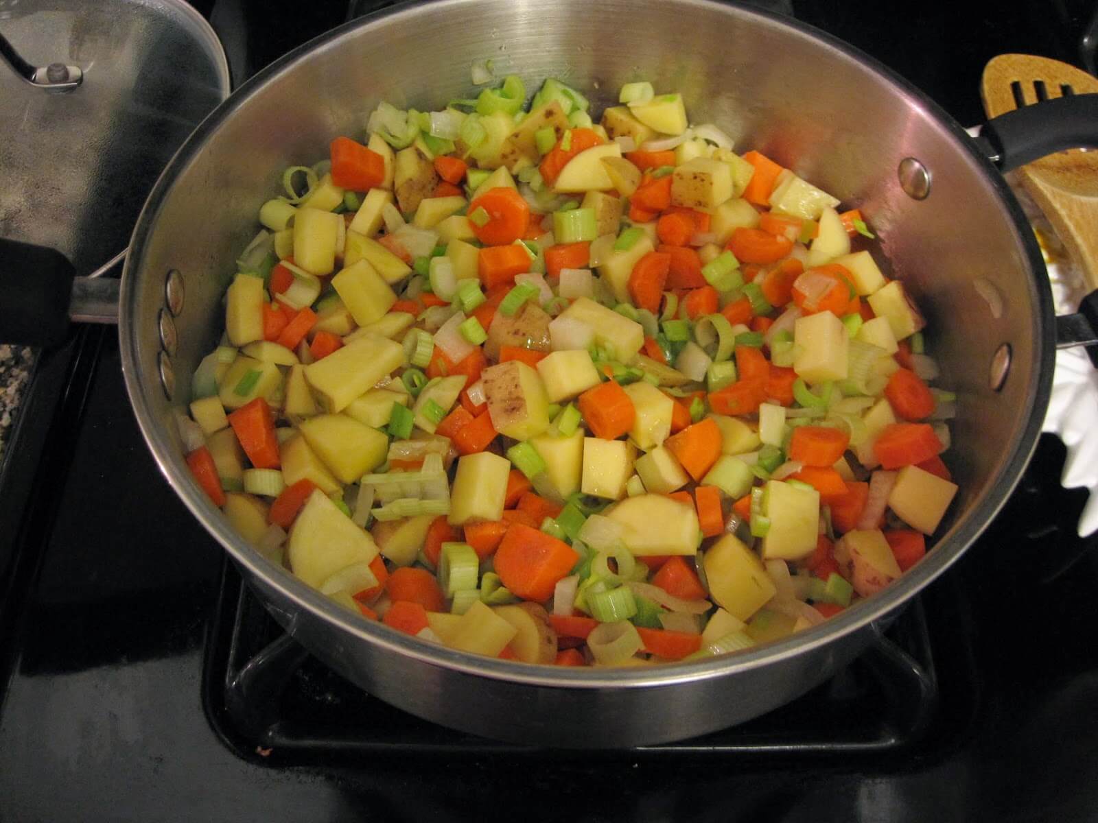 Meanwhile, heat the olive oil over medium heat in a skillet, add onion, leeks, carrots and potatoes, cook for 10 minutes. Then add garlic and tomato paste, cook for an additional minute while stirring. Add wine, bring to a boil and then reduce heat to simmer for 10 minutes until syrupy.