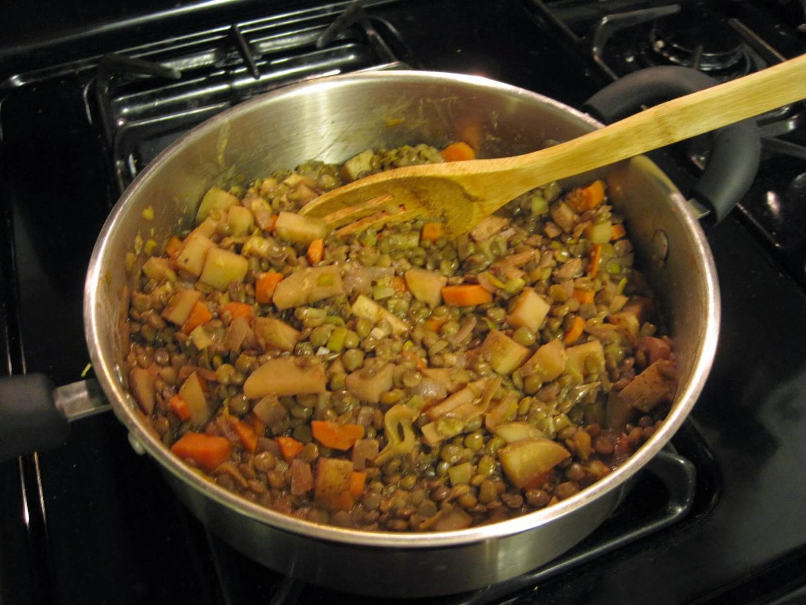 As the weather inevitably turns colder, grayer, and drier in November it’s common to crave warm and satisfying “comfort foods”. However, contrary to popular belief, comfort foods don’t need to be heavy, bloat-inducing, cheese-laden, gluten-worshiping feasts. Here’s a recipe that satisfies the comfort food craving by combining healthy lentils and vegetables with small indulgences of potatoes and red wine.