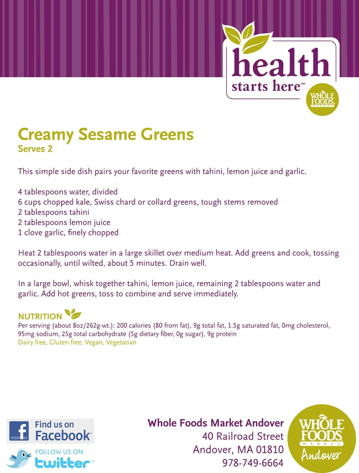Also check out these leafy greens recipes shared by Eileen Webster, Healthy Eating Specialist at Whole Foods Market in Andover, MA.